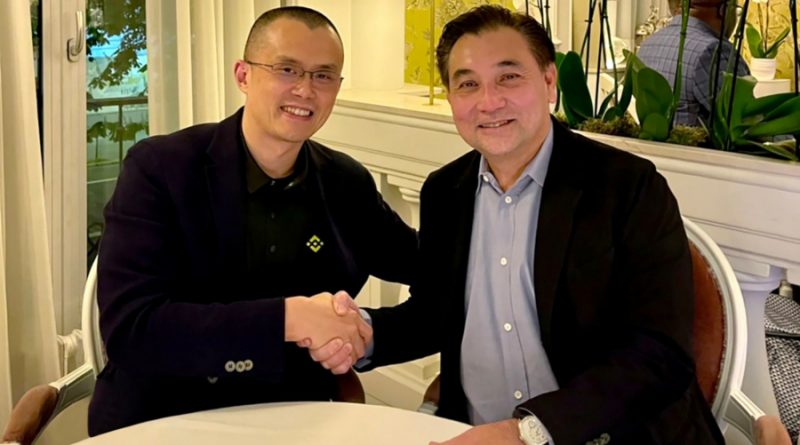 ฉางเผิง จ้าว หรือ CZ (ซ้ายมือ) ประธานเจ้าหน้าที่บริหารไบแนนซ์ (Binance) ลงนามสัญญาผู้ถือหุ้นกับนายสารัชถ์ รัตนาวะดี (ขวามือ) ประธานเจ้าหน้าที่บริหาร บริษัท กัลฟ์ เอ็นเนอร์จี ดีเวลลอปเมนท์ จำกัด (มหาชน) เมื่อวันที่ 13 เมษายน ที่กรุงปารีส ประเทศฝรั่งเศส เพื่อจัดตั้งบริษัทร่วมทุนในการดำเนินธุรกิจศูนย์ซื้อขายสินทรัพย์ดิจิทัลในประเทศไทย รวมถึงการลงทุนในสกุลเงินดิจิทัล BNB และธุรกิจศูนย์ซื้อขายสินทรัพย์ดิจิทัลในประเทศสหรัฐอเมริกา (Binance US)