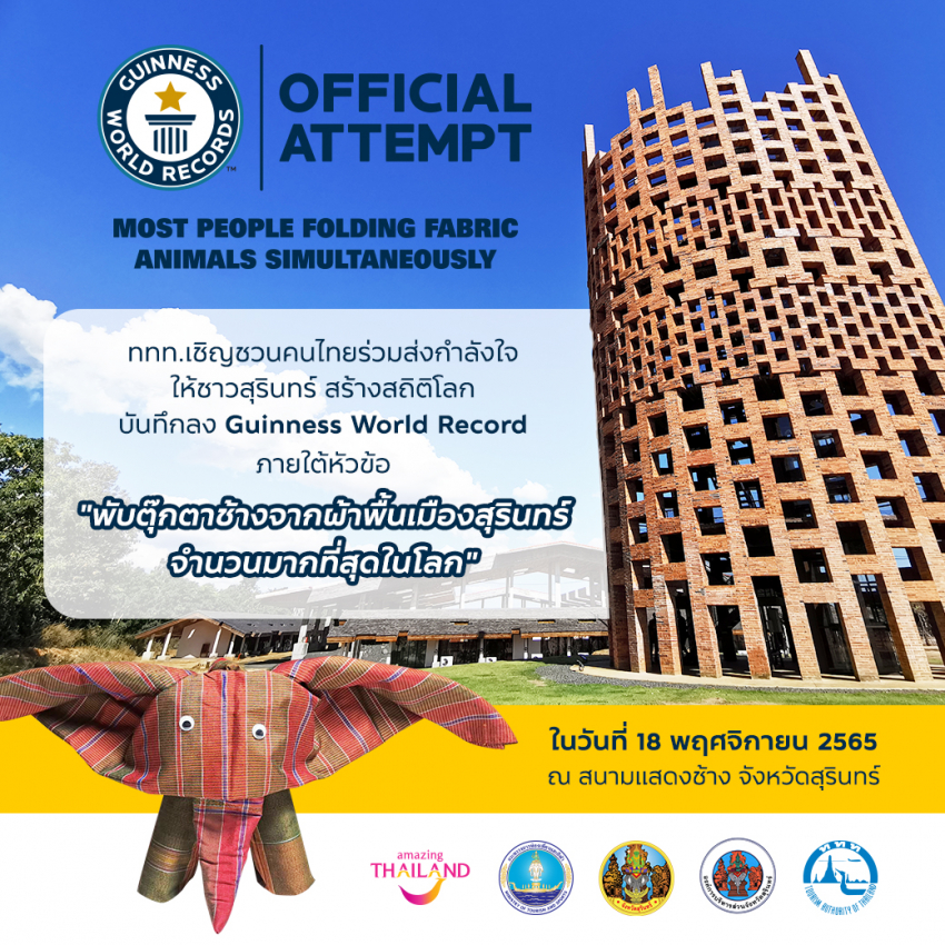 ททท. ชวนคนไทยร่วมส่งกำลังใจให้ชาวสุรินทร์สร้างประวัติศาสตร์ Guinness World Record พับตุ๊กตาช้างด้วยผ้าพื้นเมืองสุรินทร์ กว่า 9,010 ตัว!