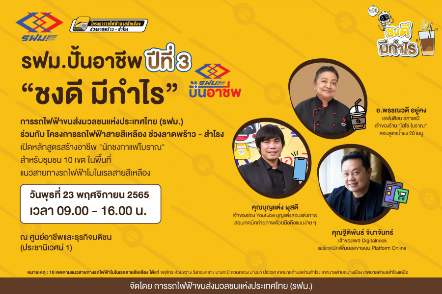 กลับมาอีกครั้งกับโครงการดี ๆ รฟม.ปั้นอาชีพ ปีที่ 3 จาก การรถไฟฟ้าขนส่งมวลชนแห่งประเทศไทย (รฟม.) ที่มุ่งมั่นปั้นอาชีพให้คนในชุมชนผู้อาศัยอยู่บริเวณสายทางโครงการรถไฟฟ้าสายสีเหลือง ทั้ง 10 เขต ได้แก่ จตุจักร ห้วยขวาง วังทองหลาง บางกะปิ สวนหลวง บางนา ประเวศ เทศบาลตำบลด่านสำโรง เทศบาลตำบลบางเมือง เทศบาลตำบลสำโรงเหนือ สามารถหาเลี้ยงชีพ มีรายได้อย่างยั่งยืน