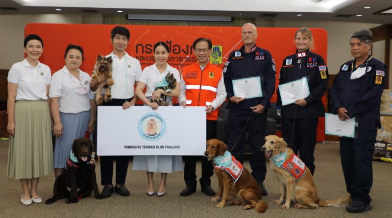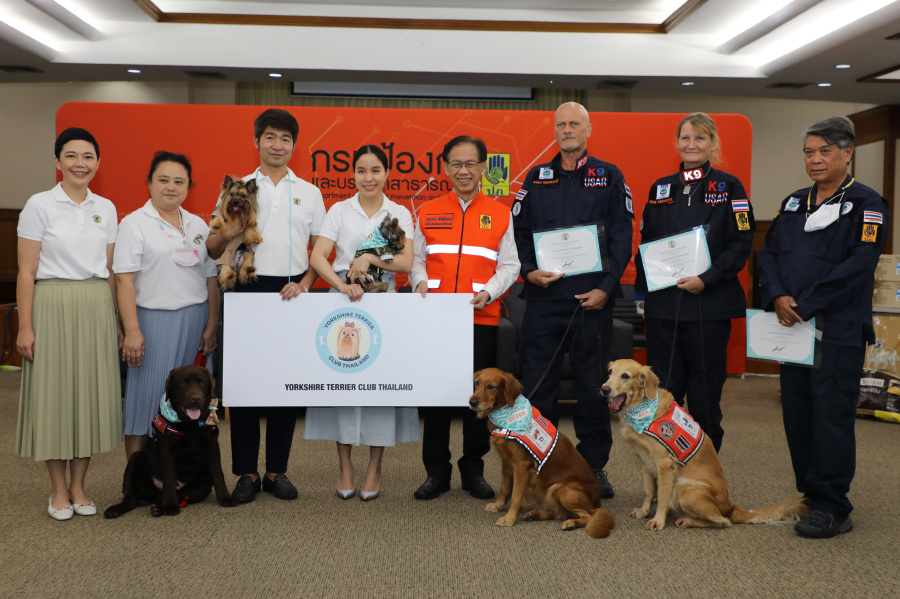 ธันย์ชนก ฟักอุดม (ที่ 5 จากซ้าย) ประธานชมรมยอร์คเชียร์เทอร์เรียประเทศไทย ได้มอบเกียรติบัตรเชิดชูเกียรติให้กับ บุญธรรม เลิศสุขีเกษม (ขวาสุด) อธิบดีกรมป้องกันและบรรเทาสาธารณภัย เจ้าหน้าที่ทีม USAR Thailand และสุนัขค้นหาและกู้ภัย K-9 เซียร่า กับ ซาฮาร่า เพื่อแสดงความชื่นชม ในการช่วยเหลือผู้ประสบภัยแผ่นดินไหวที่ตุรกี ณ กรมป้องกันและบรรเทาสาธารณภัย กระทรวงมหาดไทย โดยมี สุทธิเกียรติ โสภณิก และ ภารณี วิเศษ ร่วมงานด้วย