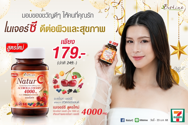 “บีไชน์ เนเจอร์ซี สูตรใหม่” ขนาดบรรจุ 30 เม็ด แถมฟรีอีก 5 เม็ดในขวด รวมเป็น 35 เม็ด ได้จัดโปรโมชั่นสุดคุ้มช่วยประหยัด เหลือเพียง 179 บาท จากปกติ ราคา 249 บาท ตั้งแต่วันนี้ – 23 มกราคม 2568 หาซื้อได้ที่ร้านเซเว่น อีเลฟเว่น ทุกสาขาทั่วประเทศ ปีใหม่ 2568 นี้ใครยังไม่ได้ให้ของขวัญคนที่คุณรัก มอบของขวัญดีๆ ให้คนที่คุณรักด้วยบีไชน์ เนเจอร์ซี เป็นตัวแทนความห่วงใยจากคุณ สามารถดูข้อมูลเพิ่มเติมได้ที่ www.bshine.co.th, FB : https://www.facebook.com/BnpHealth และ Line : @Bshine