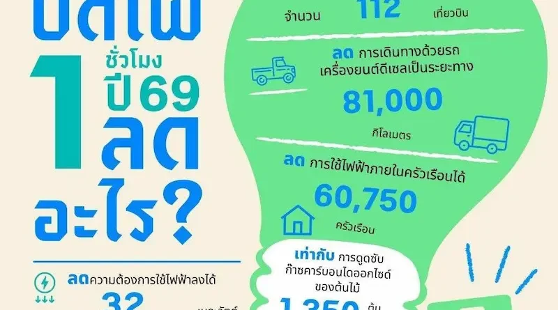 ● การร่วมปิดไฟในช่วง Earth Hour สามารถช่วยลดการใช้ไฟฟ้าในเมืองใหญ่ได้เฉลี่ย 3–4% หรือราว 73 เมกะวัตต์ภายใน 1 ชั่วโมง เทียบเท่าการลดการปล่อยก๊าซคาร์บอนไดออกไซด์กว่า 40 ตัน สะท้อนพลังของความร่วมมือจากประชาชน ภาครัฐ และภาคธุรกิจ